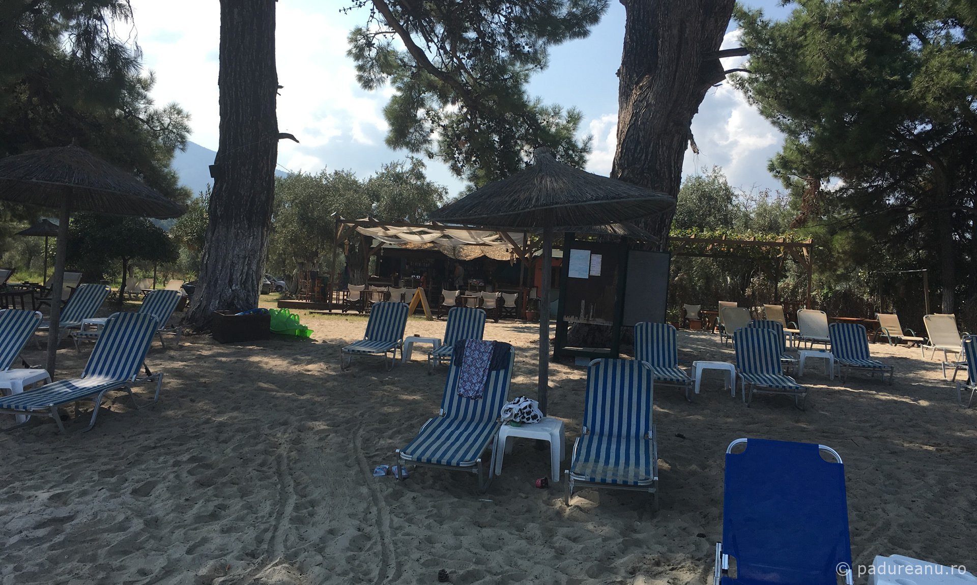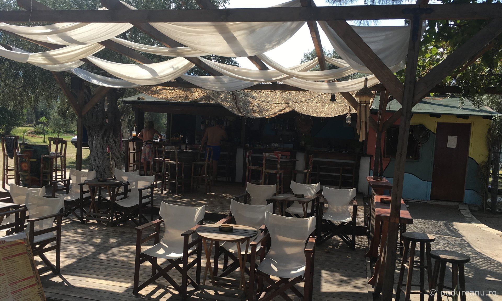 Inside an old pine tree glade, a beach bar was arranged, from where reggae music could be heard. Ouzo bottles hanging in olive trees as ornaments complemented the romantic decor. Well and truly, we felt as if we were on a secluded Caribbean beach!